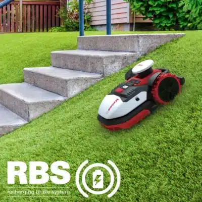 When running downhill. the robot mower is slowed down by converting its kinetic energy into electricity that’s stored in the battery for longer runtime.