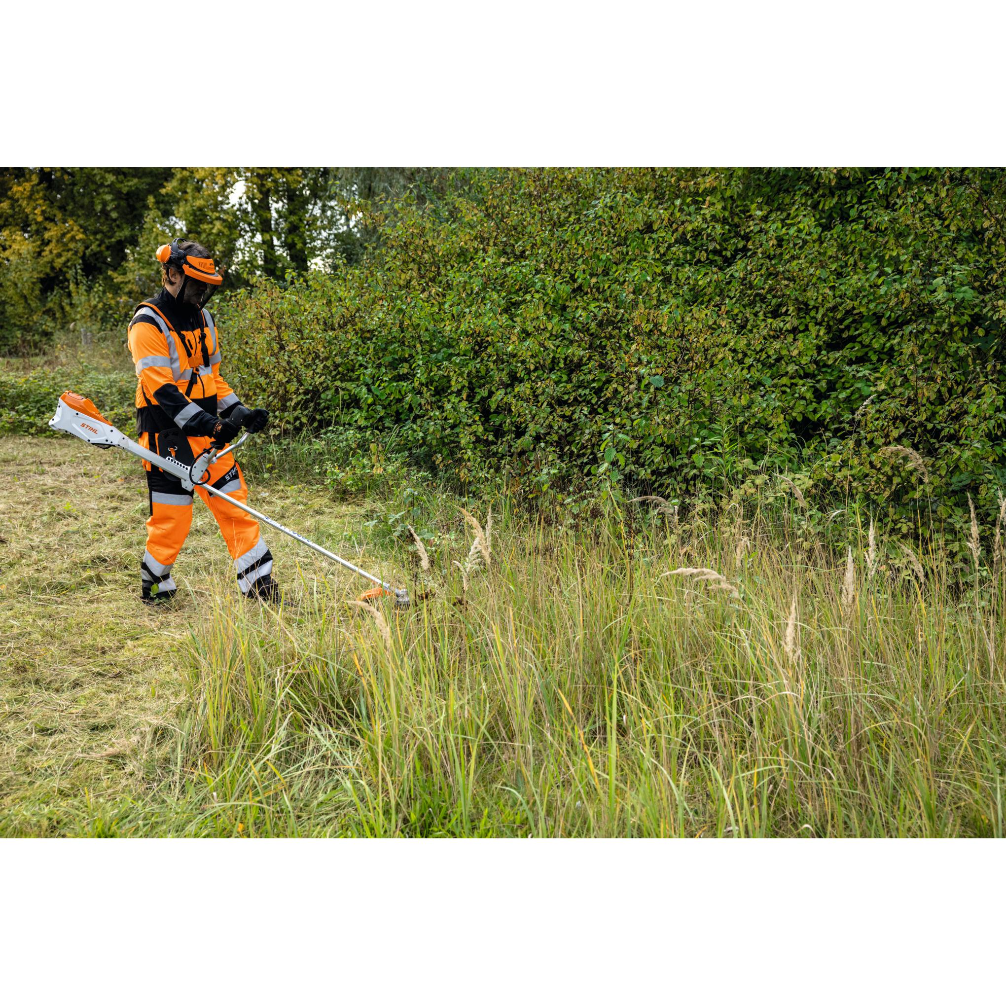 Robust and powerful cordless brushcutter with an AP battery slot in the power tool. For mowing grass and scrub in noise sensitive settings. Max. cutting circle diameter 420 mm with AutoCut head. Ergonomic control handle with three level speed pre-selection and LED display as well as infinitely variable speed control, loop handle, single shoulder harness, universal guard, air filter for long service life. Versatile use due to wide range of STIHL cutting tools. Supplied with AutoCut mowing head.